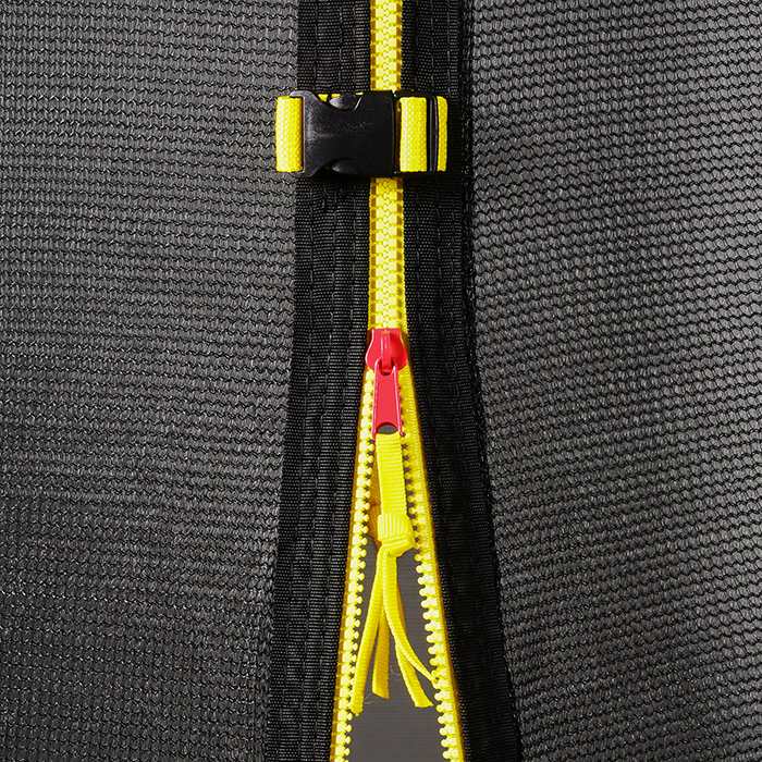 Safety Enclosure The safety enclosure is the most effective safety feature you can get for a trampoline and the Air League 10ft trampoline’s enclosure has been designed for optimal strength and durability but is still extremely easy to assemble. The mesh of the safety net is made from super strong and flexible Terylene thread and the intelligent design utilises cleverly angled poles to minimise the risk of accidents involving the upright posts. Combining this with the vertically running net and this really is an extremely well thought out and safe enclosure. Featuring a large L shaped zipped entrance which we have found to offer the best compromise of easy entry and security. The enclosure poles have foam impact padding fitted to protect users and are covered with a pvc sleeve to protect this important safety feature from the elements. The trampoline enclosure poles click together easily but due to the clever design remain in place even when faced with an out of control jumper to catch. The enclosure net is securely tied to the jump mat to keep users safely inside the trampoline and also drastically reduces the chances of accidentally landing on the spring padding. The fibre glass poles that run around the top of the enclosure ensure there is no sagging of the top of the net and help the net to run vertically down to the edge of the jump mat.