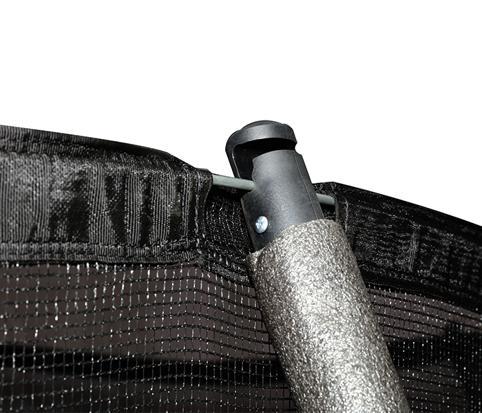 Safety Enclosure The safety enclosure is the most effective safety feature you can get for a trampoline and the Big Air Universal 12ft trampoline’s enclosure has been designed for optimal strength and durability but is still extremely easy to assemble. The mesh of the safety net is made from super strong and flexible Terylene thread and the intelligent design utilises cleverly angled poles to minimise the risk of accidents involving the upright posts. Combining this with the vertically running net and this really is an extremely well thought out and safe enclosure. Featuring a large I shaped entrance which we have found to offer the best compromise of easy entry and security. The enclosure poles have foam impact padding fitted to protect users and are covered with a pvc sleeve to protect this important safety feature from the elements. The trampoline enclosure poles click together easily but due to the clever design remain in place even when faced with an out of control jumper to catch. The enclosure net is securely tied to the jump mat to keep users safely inside the trampoline and also drastically reduces the chances of accidentally landing on the spring padding. The poles that run around the top of the enclosure ensure there is no sagging of the top of the net and help the net to run vertically down to the edge of the jump mat.