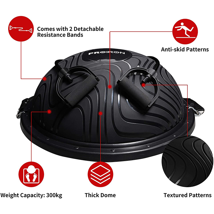 Used while doing weight training exercises increases the challenge and helps to build strength faster. Add hand-held weights while lying on the PROIRON Balance Trainer to perform arm, shoulder and chest exercises. Standing while performing squats, lunges or other leg exercises forces the engagement of more muscles and helps to improve strength and the power cords can be used to further increase intensity. Push-ups on the Balance Trainer can be performed dome side up or dome side down depending on the intensity desired.