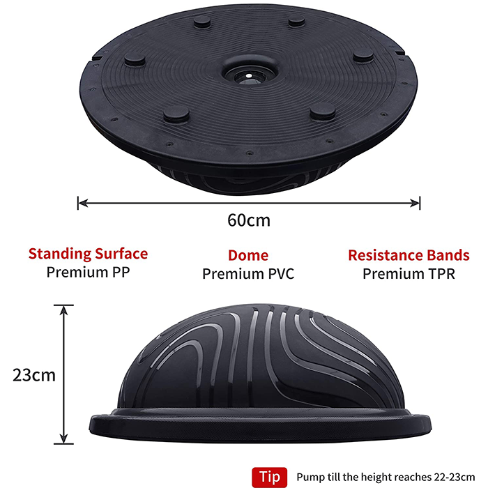Included in this incredible value package are two power cords for increased training resistance and variety and a pump so you can inflate the balance trainer & get training straight away. Remember the more air in the inflatable dome, the harder it is will increase the instability and intensity of your workouts. Release some air to make things more stable and a little easier.